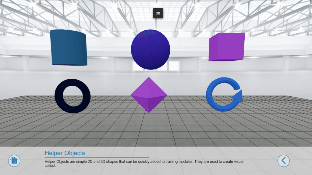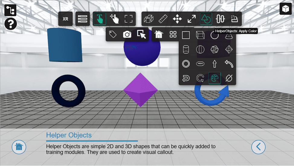 Helper Objects are simple 2D and 3D shapes – such as planes, boxes, and arrows – that can be instantly created and added to training modules. They are often used for visual callouts, instructional cues, and interactive elements.
