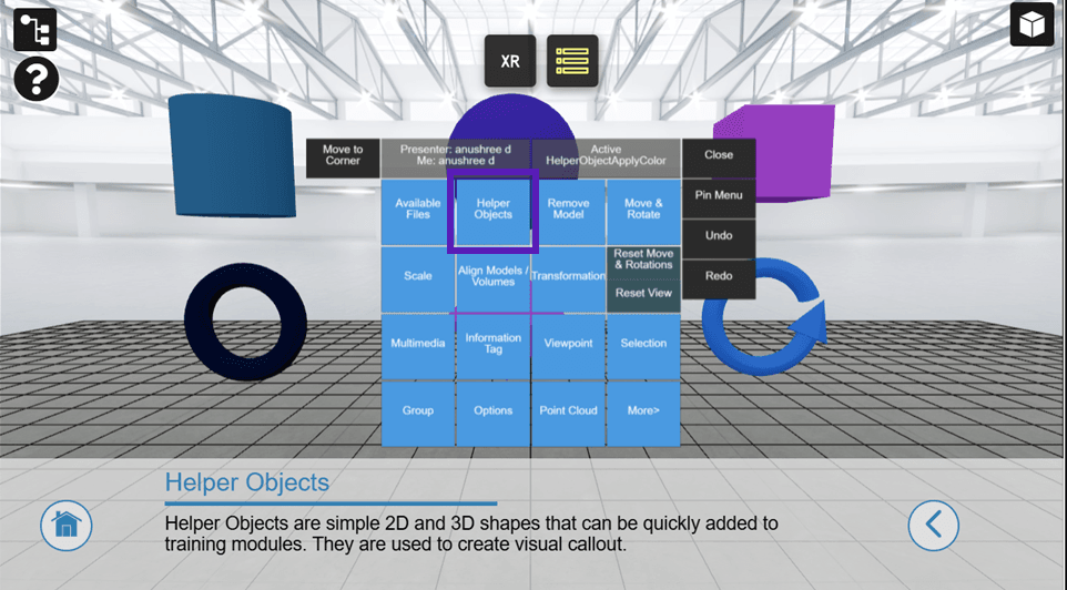 In short: Helper Objects provide a fast and flexible way to add visual guidance and simple 3D elements to your training experiences without needing complex 3D modeling.
