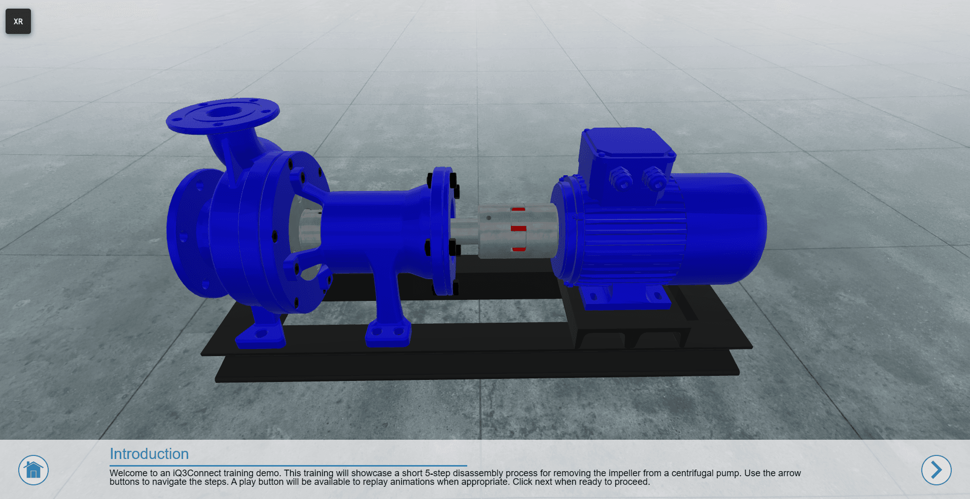 This training demonstration steps through a short disassembly sequence for a centrifugal pump. This is a single-user self-guided training example.